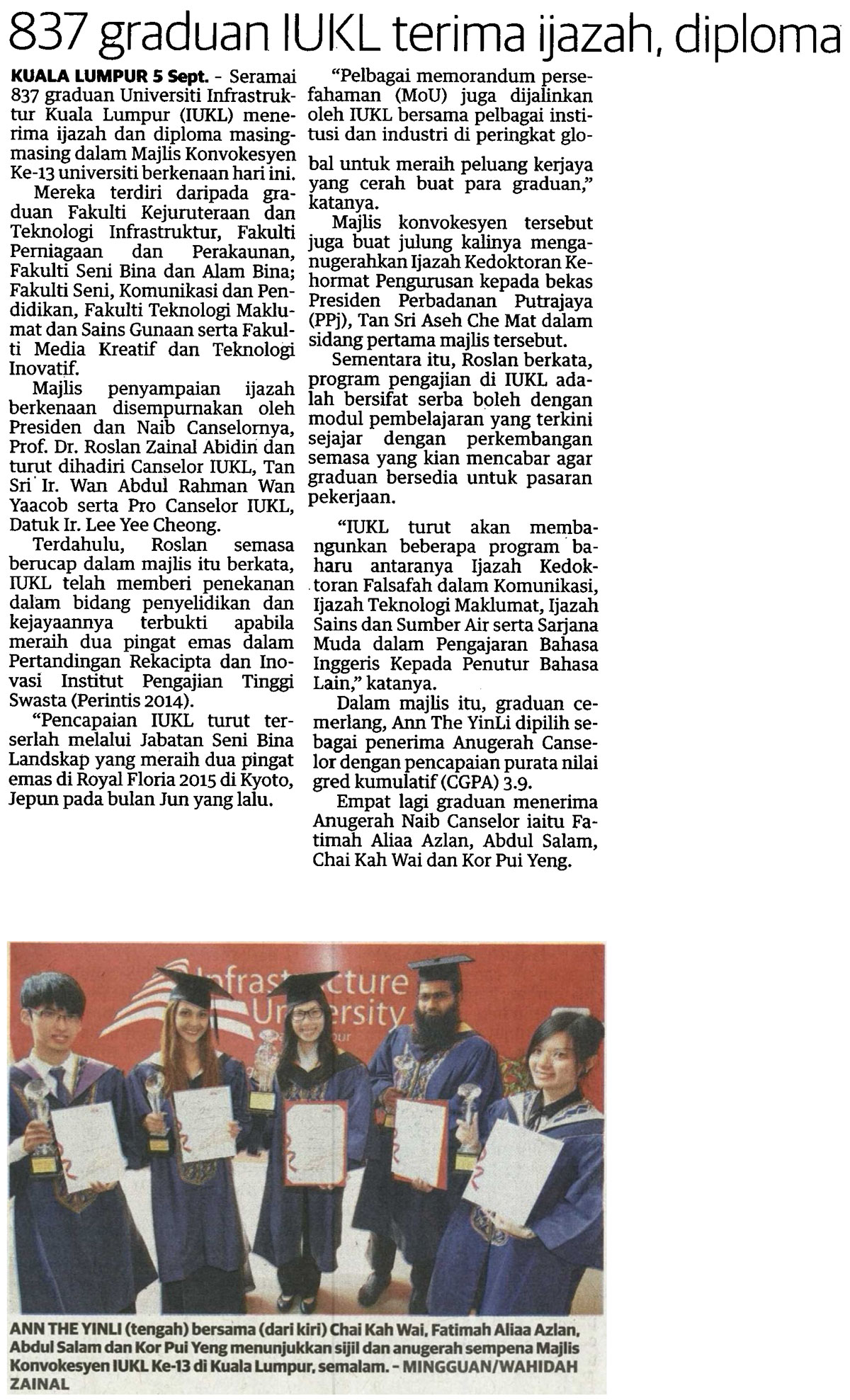 KUALA LUMPUR 5 Sept. Seramai 837 graduan Universiti Infrastruktur Kuala Lumpur (IUKL) menerima ijazah dan diploma masingmasing dalam Majlis Konvokesyen Ke13 universiti berkenaan hari ini. Mereka terdiri daripada graduan Fakulti Kejuruteraan dan Teknologi Infrastruktur, Fakulti Perniagaan dan Perakaunan, Fakulti Seni Bina dan Alam Bina? Fakulti Seni, Komunikasi dan Pendidikan, Fakulti Teknologi Maklumat dan Sains Gunaan serta Fakulti Media Kreatif dan Teknologi Inovatif. Majlis penyampaian ijazah berkenaan disempurnakan oleh Presiden dan Naib Canselomya, Prof. Dr. Roslan Zainal Abidin dan turut dihadiri Canselor IUKL, Tan Sri Ir. Wan Abdul Rahman Wan Yaacob serta Pro Canselor IUKL, Datuk Ir. Lee Yee Cheong.