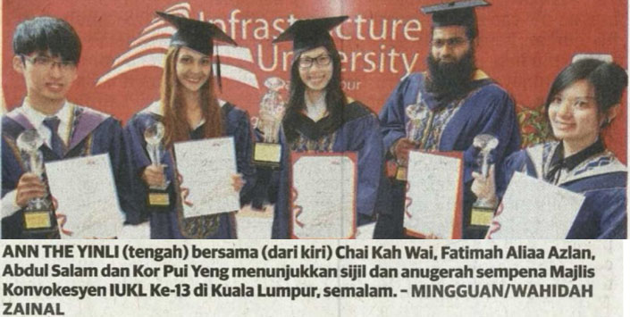 “IUKL turut akan membangunkan beberapa programme baharu antaranya Ijazah Kedoktoran Falsafah dalam Komunikasi, Ijazah Teknologi Maklumat, Ijazah Sains dan Sumber Air serta Sarjana Muda dalam Pengajaran Bahasa Inggeris Kepada Penutur Bahasa Lain,” katanya. Dalam majlis itu, graduan cemerlang, Ann The YinLi dipilih sebagai penerima Anugerah Canselor dengan pencapaian purata nilai gred kumulatif (CGPA) 39. Empat lagi graduan menerima Anugerah Naib Canselor iaitu Fatimah Aliaa Azlan, Abdul Salam, Chai Kah Wai dan Kor Pui Yeng.