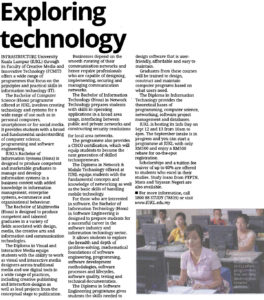 INFRASTRUCTURE University Kuala Lumpur (IUKL) through its Faculty of Creative Media and Innovative Technology (FCMIT) offers a wide range of programmes that focus on the principles and practical skills in information technology (IT). The Bachelor of Computer Science (Hons) programme offered at IUKL involves creating technology and systems for a wide range of use such as in personal computers, smartphones or for social media. It provides students with a broad and fundamental understanding of computer science, programming and software engineering. IUKL’s Bachelor of Information Systems (Hons) is designed to produce competent and marketable graduates to manage and develop information systems in a business context with added knowledge in information management, enterprise systems, ecommerce and organizational behavior.