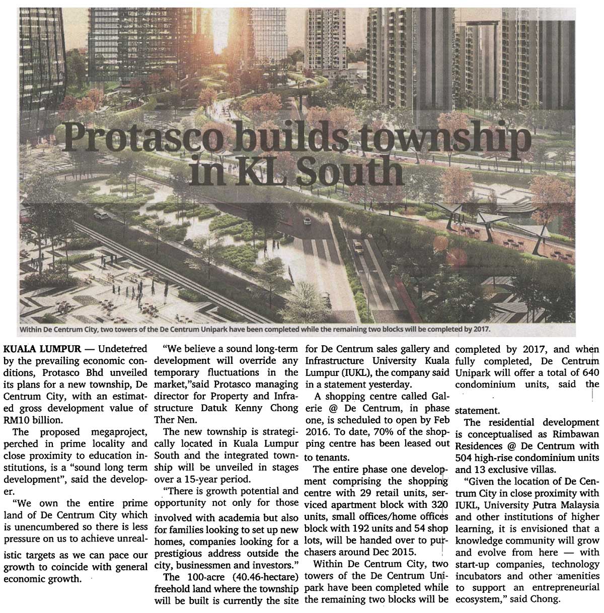 Datuk Kenny Chong Ther Nen. The new township is strategically located in Kuala Lumpur South and the integrated township will be unveiled in stages over a 15year period. “There is growth potential and opportunity not only for those involved with academia but also for families looking to set up new homes, companies looking for a prestigious address outside the city, businessmen and investors.” The 100acre (40.46hectare) freehold land where the township will be built is currently the site for De Centrum sales gallery and Infrastructure University Kuala Lumpur (IUKL), the company said in a statement yesterday. A shopping centre called Galerie @ De Centrum, in phase one, is scheduled to open by Feb 2016. To date, 70% of the shopping centre has been leased out to tenants. The entire phase one development comprising the shopping centre with 29 retail units, serviced apartment block with 320 units, small offices/home offices block with 192 units and 54 shop lots, will be handed over to purchasers around Dec 2015. Within De Centrum City, two towers of the De Centrum Unipark have been completed while the remaining two blocks will be completed by 2017, and when fully completed, De Centrum Unipark will offer a total of 640 condominium units, said the statement. The residential development is conceptualised as Rimbawan Residences @ De Centrum with 504 highrise condominium units and 13 exclusive villas. “Given the location of De Centrum City in close proximity with IUKL, University Putra Malaysia and other institutions of higher learning, it is envisioned that a knowledge community will grow and evolve from here — with startup companies, technology incubators and other amenities to support an entrepreneurial ecosystem,” said Chong.