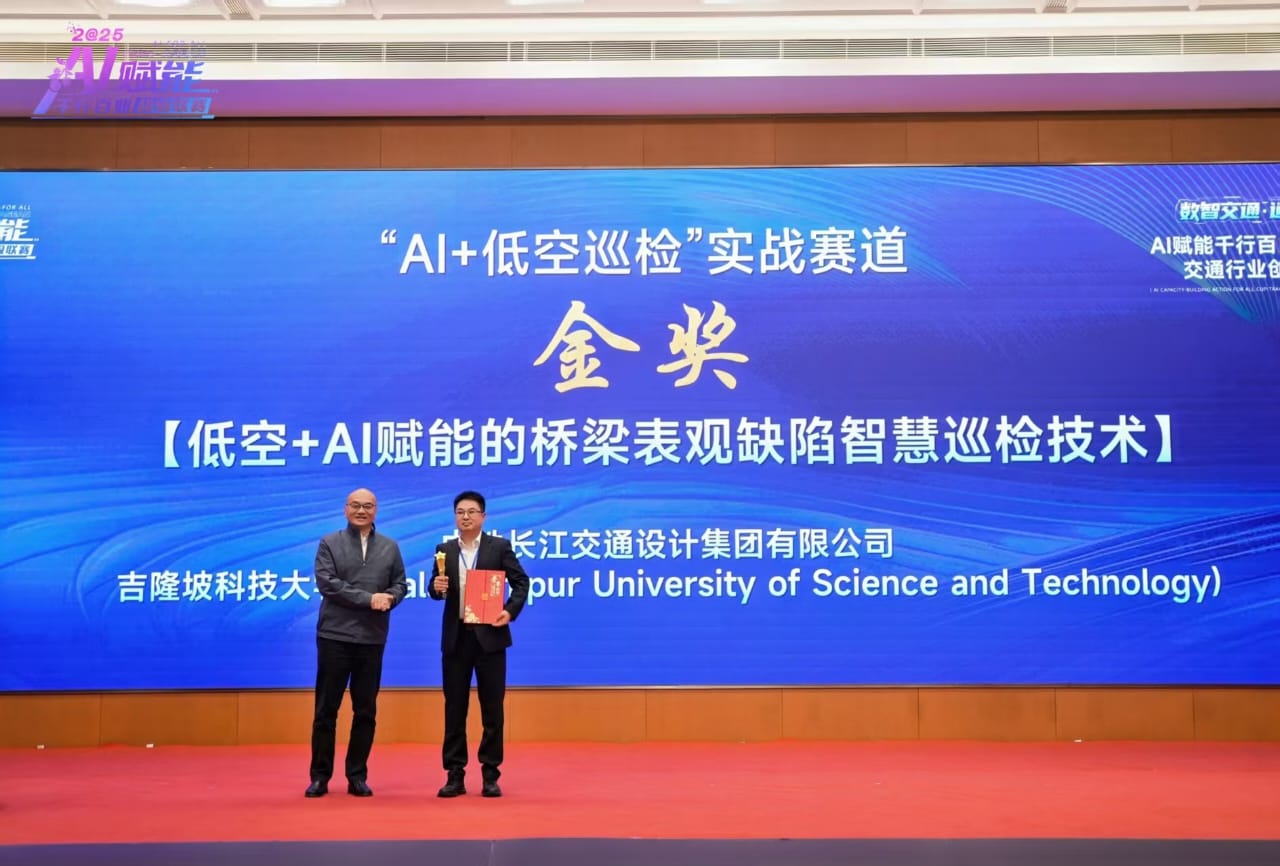 In the “AI + Low-Altitude Inspection” category, the joint team comprising lecturers from Kuala Lumpur University of Science and Technology (KLUST), led by Assoc Prof. Ts. Dr. Tadiwa Elisha Nyamasvisva, and China Railway Changjiang Transport Design Group Co., LTD., won the Gold Award for their project titled “Smart Bridge Surface Defect Inspection Technology Enabled by Low-Altitude UAV + AI.”
