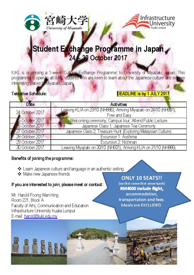 IUKL is organising a 1-week ‘Cultural Exchange Programme’ to University of Miyazaki, Japan. This programme is open to all IUKL students who are keen to learn about the Japanese culture and explore interesting places in Miyazaki, Japan.